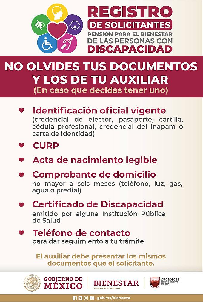 ZACATECAS, ZAC.- La Delegación de Programas para el Desarrollo en Zacatecas anunció que del 6 al 30 de junio iniciará el registro de solicitudes de la Pensión del Bienestar para las personas con discapacidad permanente.