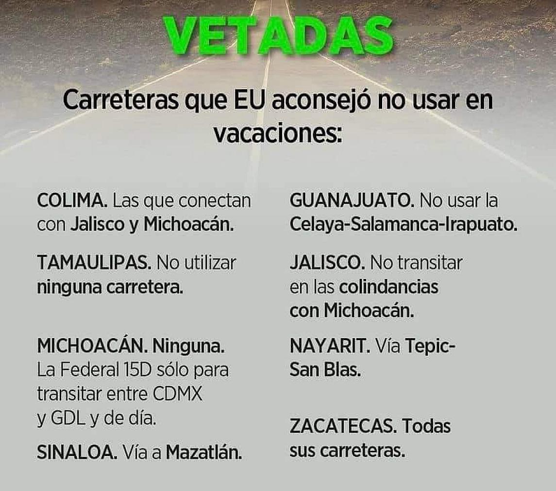 Así como la carretera Celaya-Salamanca-Irapuato, en Guanajuato; la zona de Jalisco que colinda con Michoacán, y las carreteras de Cocula; en Nayarit, la vía Tepic-San Blas; en Nogales, Sonora, y casi todas las carreteras de Zacatecas.