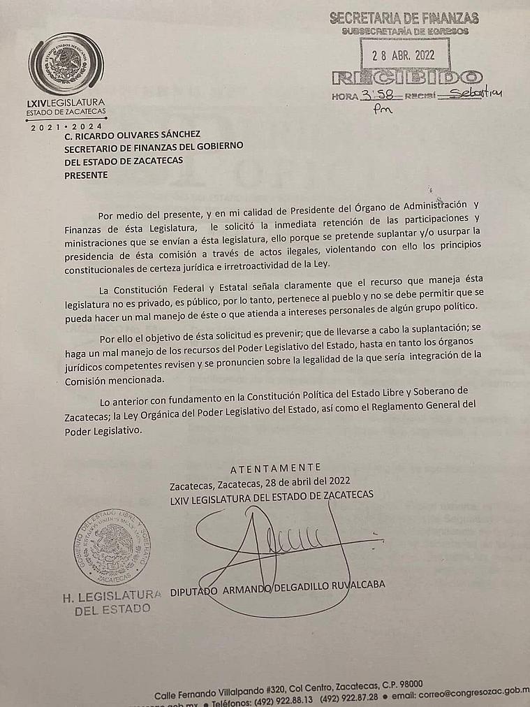 ZACATECAS, ZAC.- El líder del Sindicato de Trabajadores del Congreso del Estado anunció que luego de la solicitud presentada por diputados locales para que la Secretaria de Finanzas del estado retenga la ministración de los recursos de la Legislatura, están incluidos el salario y las prestaciones de todos los trabajadores, “sin regateo daremos la lucha legal y de movilización si se consuma el bloqueo al salario digno de trabajadoras y trabajadores”.