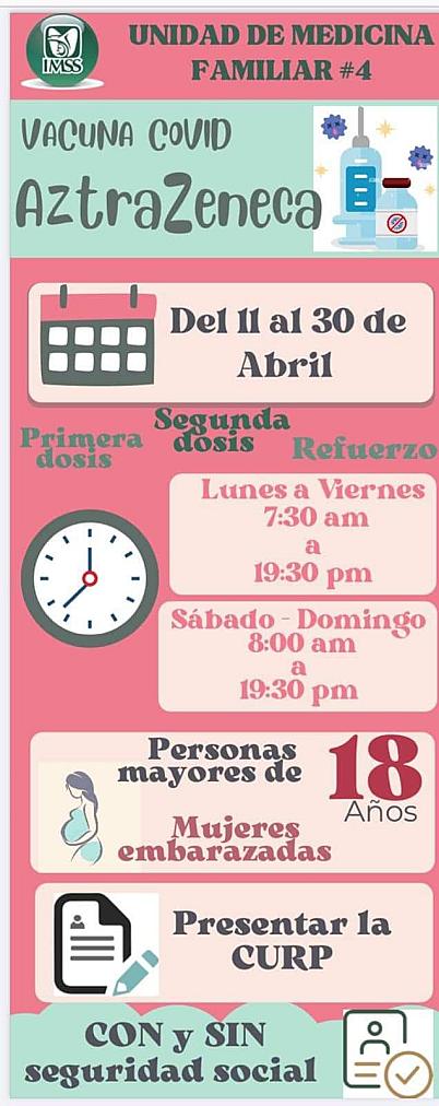ZACATECAS, ZAC.- El Instituto Mexicano del Seguro Social (IMSS) anunció que del 11 al 30 de abril, aplicará la vacuna AstraZeneca a embarazadas y mayores de 18 años, así como primera y segunda dosis o bien el refuerzo a quien así lo requiera.