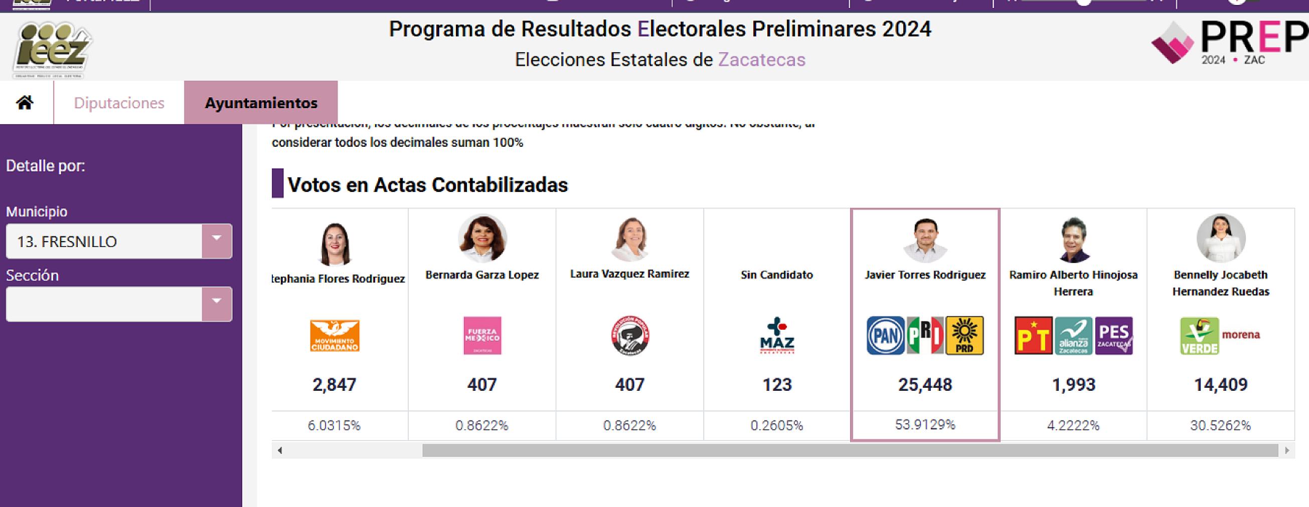 FRESNILLO, ZAC.- Con Javo Torres, de Fuerza y Corazón por Zacatecas, aventaja en la contienda electoral con 53.9 por ciento de la votación efectiva, de acuerdo a Programa de Resultados Preliminares del IEEZ.