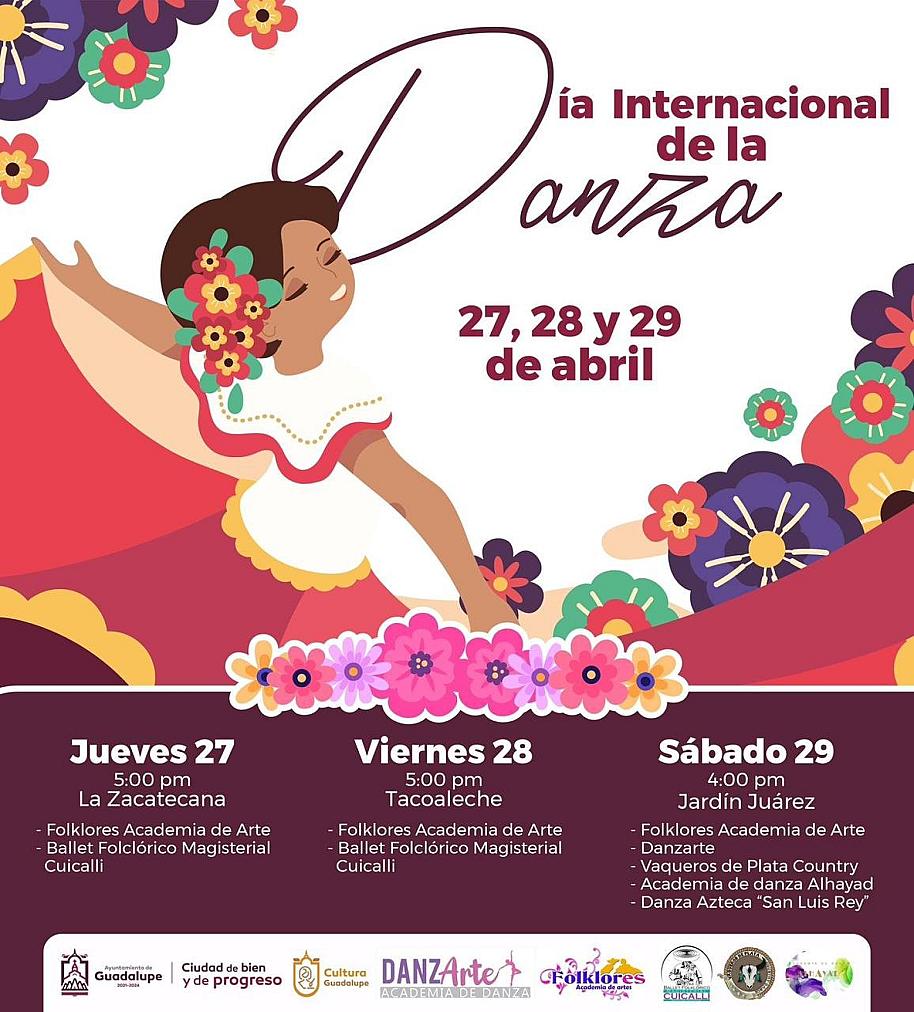 Por esta razón, el Instituto de Cultura del Municipio de Guadalupe llevará a cabo durante los días 27, 28 y 29 de abril; una serie de actividades dancísticas en el Jardín Juárez de la Ciudad de Guadalupe, así como en las comunidades de La Zacatecana y Tacoaleche.