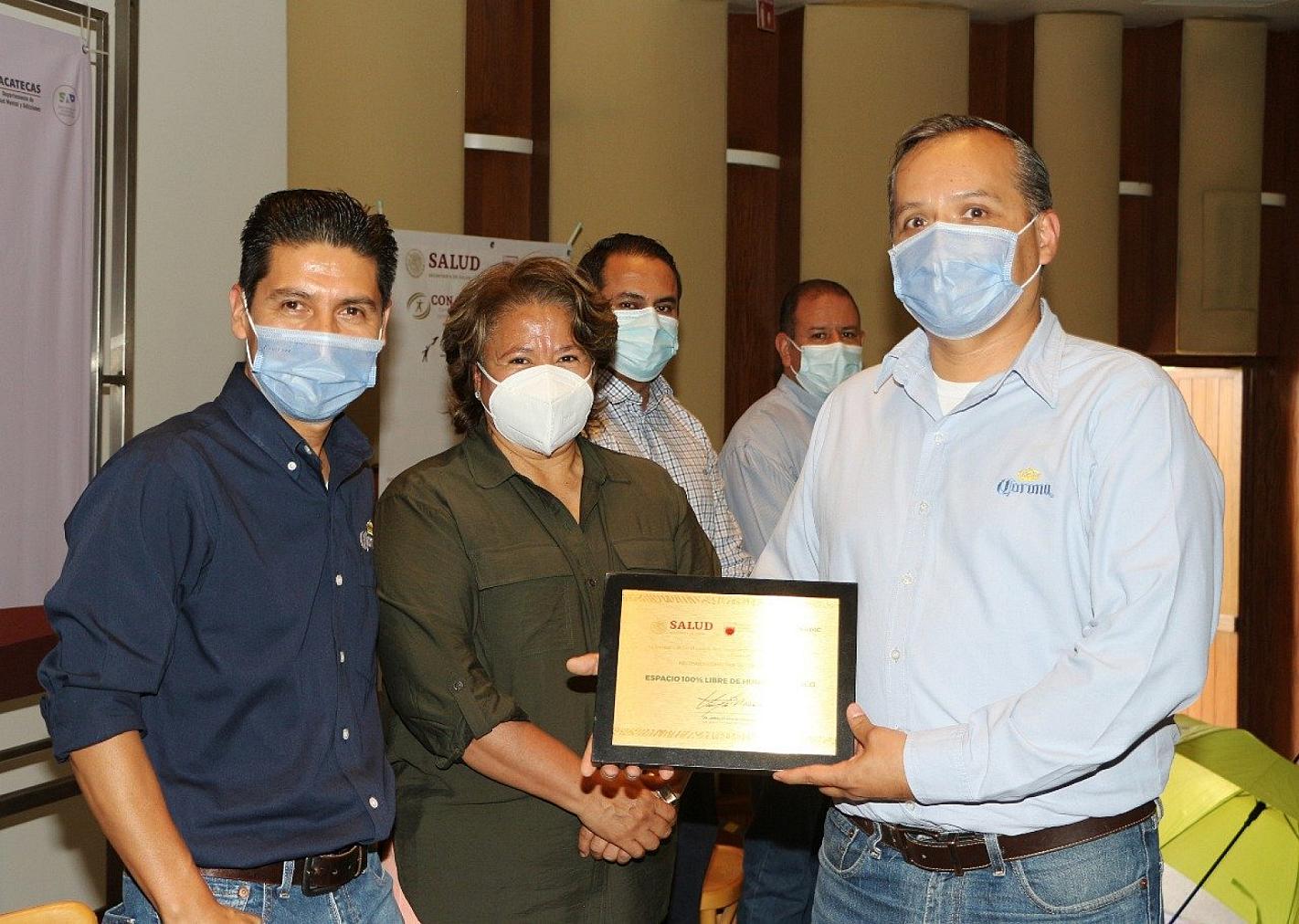 ZACATECAS, ZAC.- Con la finalidad de prevenir las adicciones y elevar el bienestar de la población, la administración que encabeza David Monreal Ávila, a través de la Secretaría de Salud (SSZ), entregó la certificación de edificio libre de humo de tabaco y emisiones a la Compañía Cervecera de Zacatecas, ubicada en el municipio de Calera.