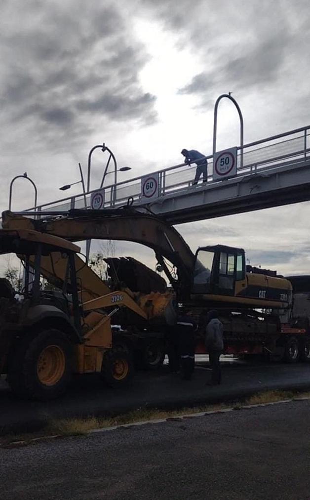 El operador del tráiler no calculó la medida del puente y con la parte alta de la maquinaria impactó contra el puente peatonal que une el complejo de Ciudad Administrativa con la Unidad Deportiva Norte.
