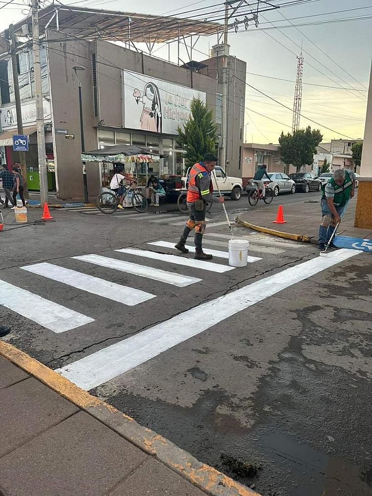 CALERA, ZAC.- El personal de la Dirección de Desarrollo Económico y Social finalizó los trabajos de pintura en el primer cuadro de la ciudad, beneficiando principalmente a los peatones.
