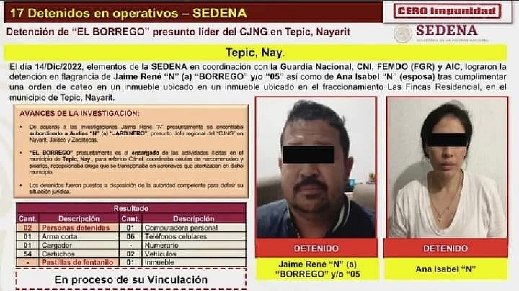 El subsecretario de Seguridad y Protección Ciudadana (SSPC), Ricardo Mejía, informó que fue detenido Jaime René, alias 'El Borrego', presunto operador del Cártel de Jalisco Nueva Generación (CJNG), durante un operativo de cateo en un inmueble ubicado en Tepic, Nayarit.