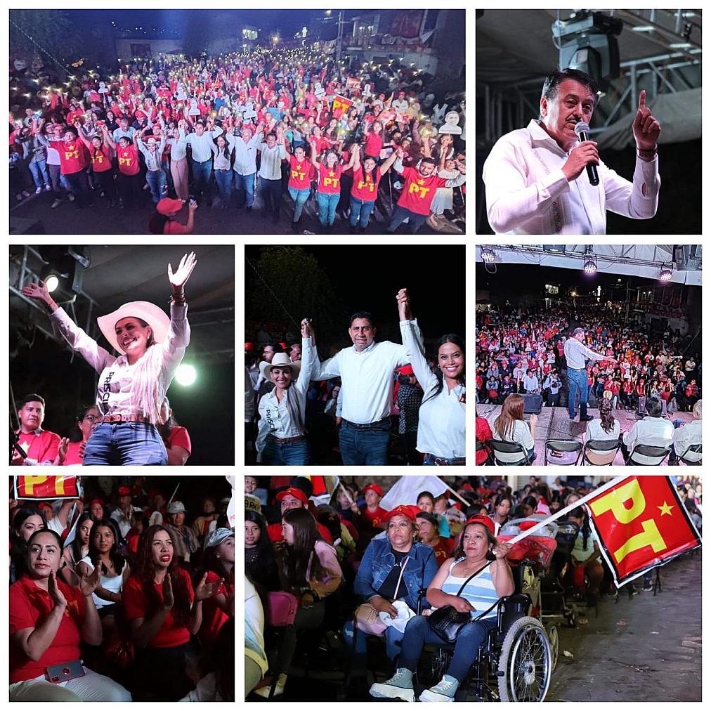 TRANCOSO, ZAC.- Acompañados del comisionado político nacional del Partido del Trabajo (PT) en Zacatecas, Alfredo Femat Bañuelos, y de la senadora Geovanna Bañuelos de la Torre, este lunes, los candidatos Antonio “Polo” Rocha, Ana Luisa del Muro García y Priscila Benítez Sánchez, cerraron campaña en el municipio de Trancoso.