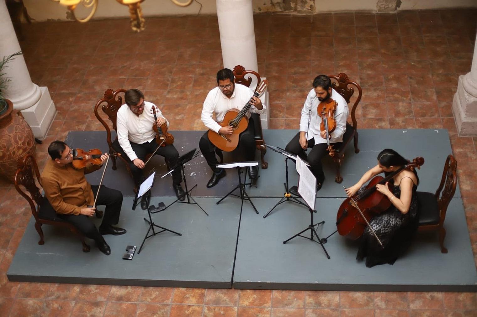 JEREZ, ZAC.- El Cuarteto de Cuerdas Aldebarán llenó de armonía la antigua casona conocida como edificio Alkázar, sede del Instituto Jerezano de Cultura (IJC), durante la celebración de los Domingos Familiares, proyecto del Ayuntamiento que encabeza el doctor José Humberto Salazar Contreras.