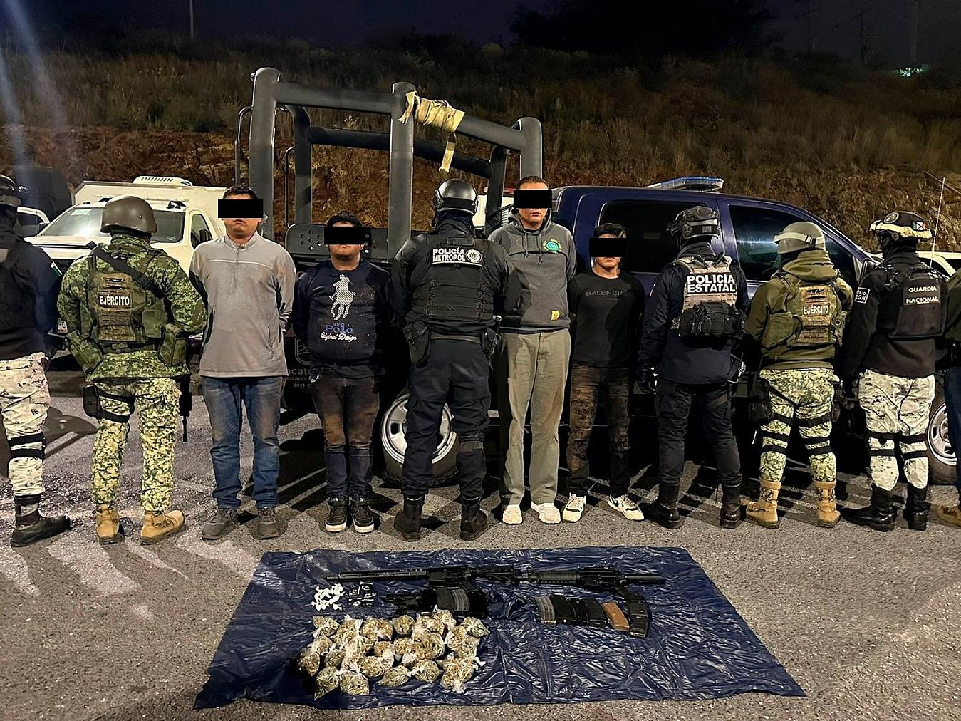GUADALUPE, ZAC.- Elementos de la Policía Estatal Preventiva (PEP), en colaboración con el Ejército Mexicano, la Guardia Nacional y Policía de Investigación de la Fiscalía General de Justicia del Estado (FGJEZ), detuvieron a cuatro personas en posesión de armas de fuego y probable droga.