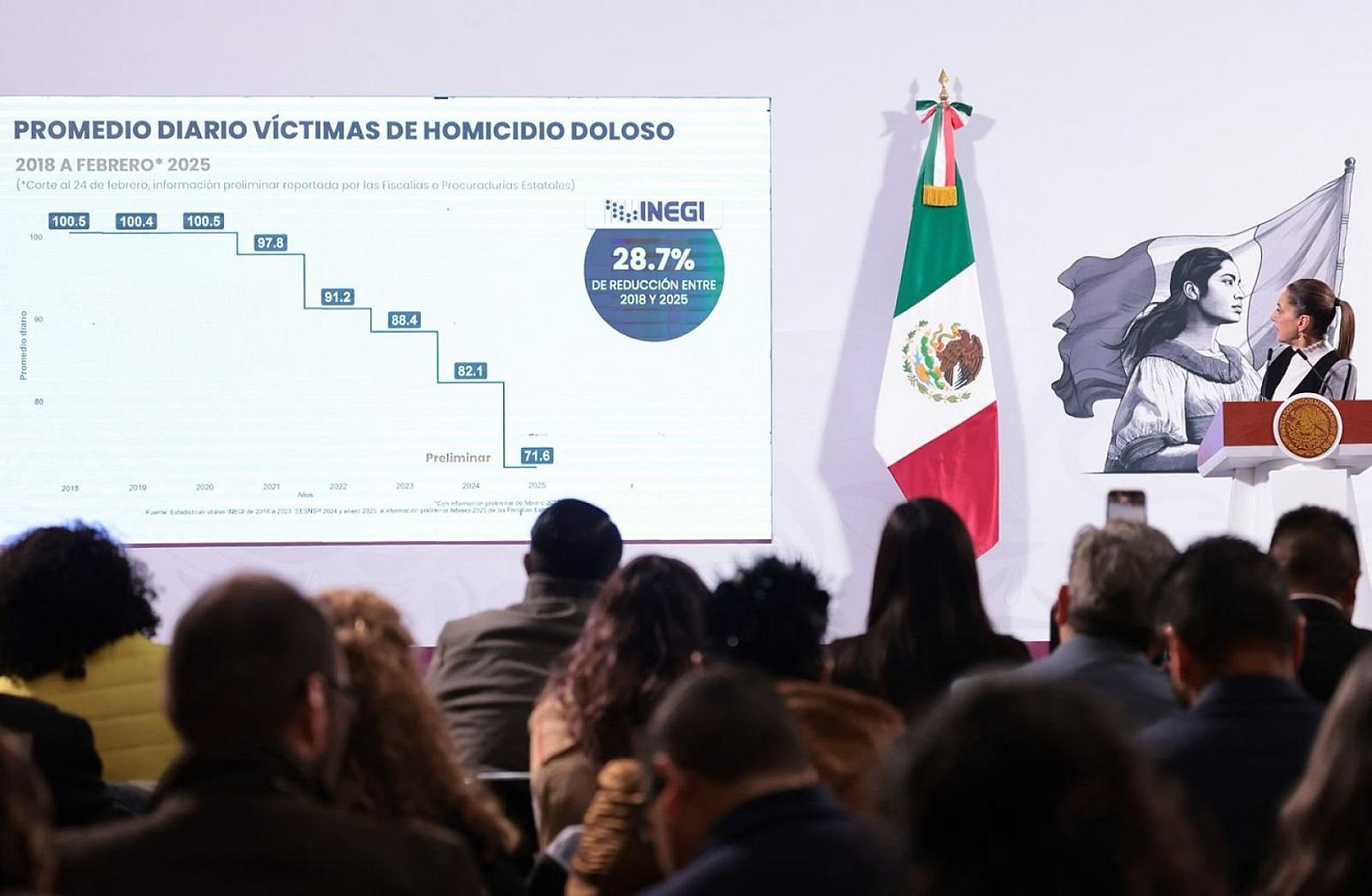 CIUDAD DE MÉXICO.- La presidenta de México, Claudia Sheinbaum Pardo, destacó que de acuerdo con datos preliminares, del 2018 al 24 de febrero de 2025, se ha logrado una reducción del 28.7 por ciento en el promedio diario de víctimas de homicidio doloso en el país, además de que, gracias a la Estrategia Nacional de Seguridad, al cierre de 2024 e inicios del 2025 se han registrado 10 homicidios diarios menos.
