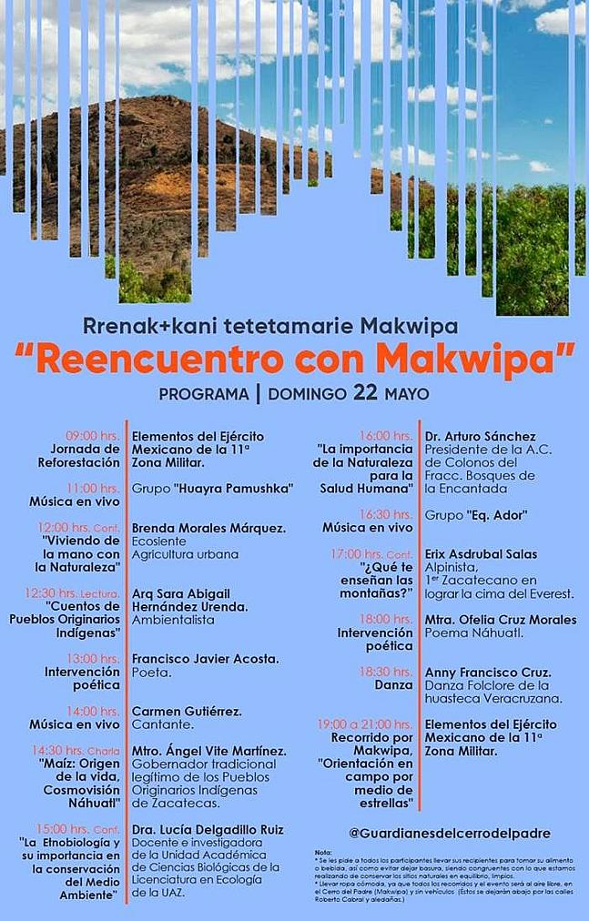 ZACATECAS, ZAC.- Este domingo se efectuará el rencuentro con Makwipa, evento organizado por los Guardianes del Cerro del Padre con un programa de nueve de la mñana a siete de la noche, y donde se trata de redescubrir la relación de los habitantes de esta tierra hacía con esta área natural protegida, además de crear conciencia en torno a la importancia de su cuidado y preservación, además de reconocer y cuidar el paso de la ruta Wixárika como un importante centro energético en la cosmovisión de los grupos originarios.