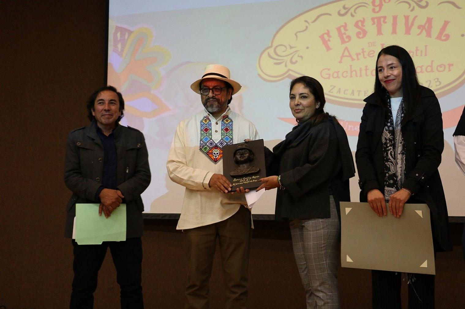 La distinción fue entregada por Sara Hernández de Monreal, presidenta honorífica del Sistema Estatal para el Desarrollo Integral de la Familia (SEDIF), con el acompañamiento de la Directora del Instituto Zacatecano de Cultura, María de Jesús Muños Reyes; Hamurabi Gamboa Rosales, director del Consejo Zacatecano de Ciencia Tecnología e Innovación, y el Coordinador artístico del Festival, Martín Letechipía Alvarado.