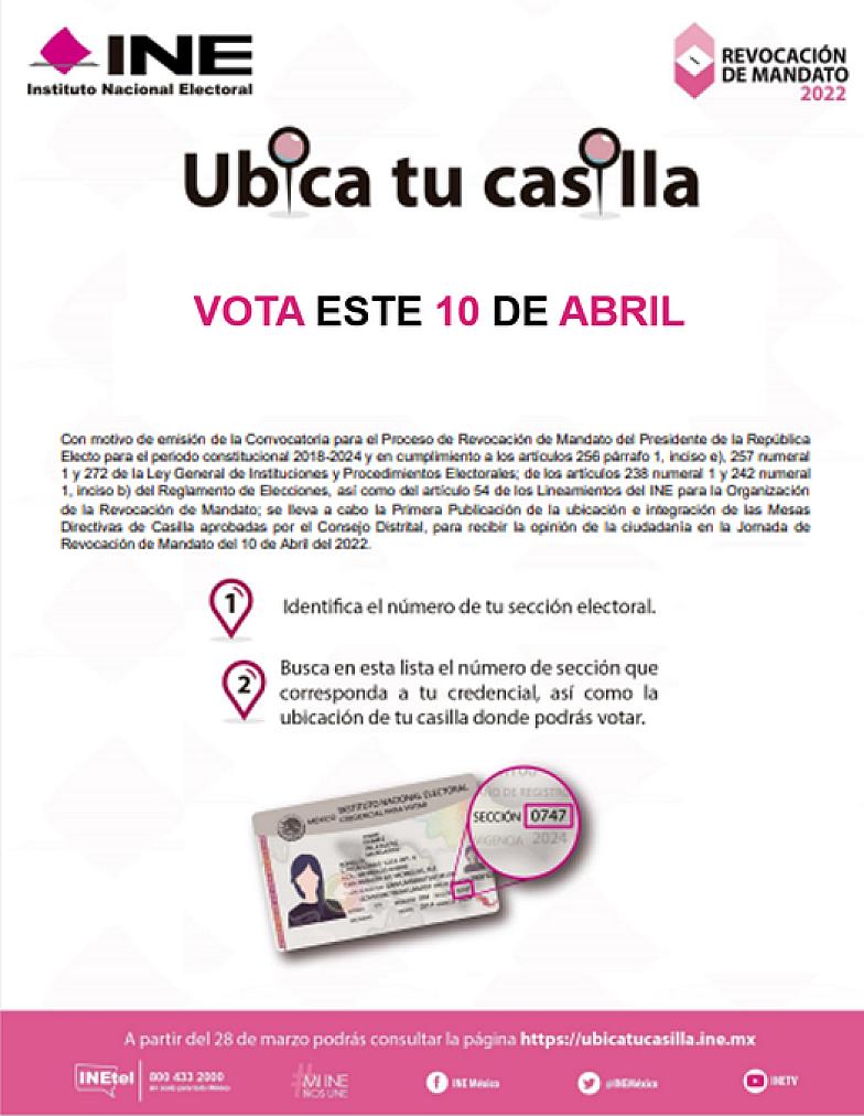 La autoridad electoral llamó a los electores a ubicar su casilla para la jornada del domingo, para lo que se deberá ingresar al portal electrónico “Ubica tu casilla”: ubicatucasilla.ine.mx, al asegurar que los listados nominales ya fueron publicados en plazas públicas de los 59 municipios del estado, así como en casas centros de salud, escuelas y presidencias municipales, así como en las propias Juntas Distritales y Local del INE y en Oficinas del Instituto Electoral del Estado de Zacatecas.