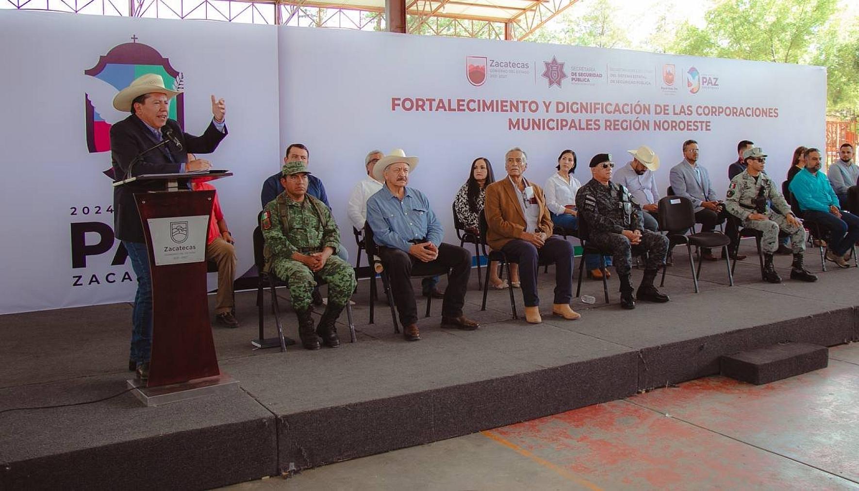 MIGUEL AUZA, ZAC.- Con el objetivo de consolidar la pacificación de Zacatecas, el Gobierno del Estado entregó ambulancias, uniformes y equipamiento a corporaciones municipales de seguridad de la zona oeste-noroeste del estado, además de anunciar que, en 2025, los policías de todo el estado ganarán entre 16 mil y 18 mil pesos al mes.