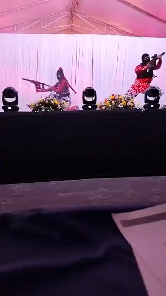 En la rutina, los jóvenes simulan enfrentamientos armados y exhiben carteles con los nombres de alcaldes asesinados, una referencia directa a los altos niveles de violencia que atraviesa el estado.