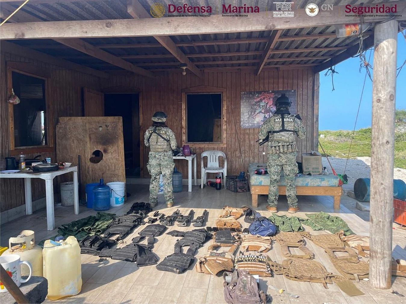 -En el poblado “Los Arroyos”, en el municipio de Soto la Marina, la Semar aseguró y puso a disposición de la FGR, 632 cartuchos, 18 cargadores, uniformes tipo militar, dos cascos tácticos, dos baterías para dron, ponchallantas, pertrechos y dos vehículos abandonados, uno de ellos con blindaje artesanal.