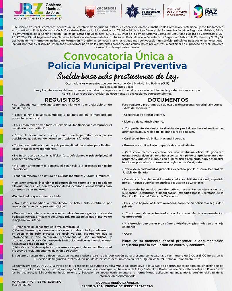 A través de este proceso, el Ayuntamiento de Jerez busca cubrir la totalidad de las vacantes disponibles en la Policía Preventiva, para lo cual todas las y los interesados deberán cumplir con los requisitos establecidos y aprobar satisfactoriamente el proceso de reclutamiento y selección.