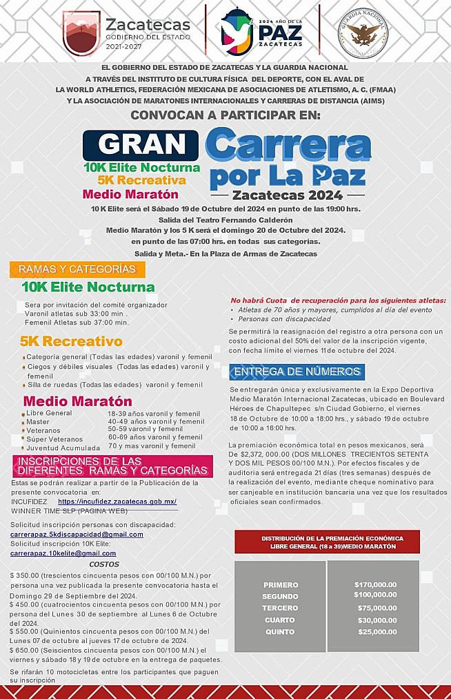 ZACATECAS, ZAC.- El Gobierno del Estado y la Guardia Nacional convocan a participar en la Gran Carrera por la Paz Zacatecas 2024, en las categorías 10K élite nocturna, 5k recreativa y medio maratón, todas en las ramas femenil y varonil, que se llevará a cabo el 19 y 20 de octubre.