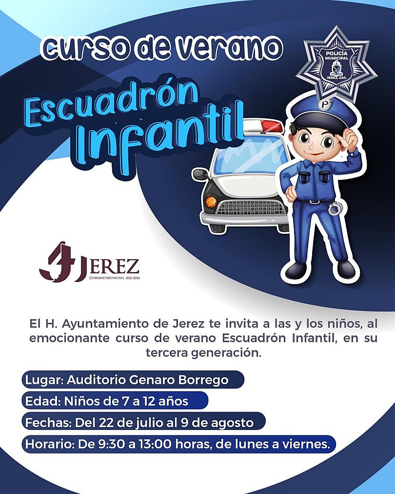 JEREZ, ZAC.- La Dirección de Seguridad Pública Municipal invita a niños de 7 a 12 años al curso gratuito de verano del Escuadrón Infantil, en su tercera generación, a realizarse del 22 julio al 9 de agosto, con el fin de brindarles una experiencia divertida y enriquecedora en su periodo vacacional.