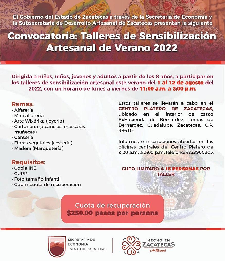 ZACATECAS, ZAC.- Con el objetivo de promover las tradiciones y cultura de Zacatecas, el Gobierno que encabeza el mandatario David Monreal Ávila, a través de la Secretaría de Economía y la Subsecretaría de Desarrollo Artesanal, pone a disposición de toda la población los talleres de sensibilización artesanal de verano 2022.