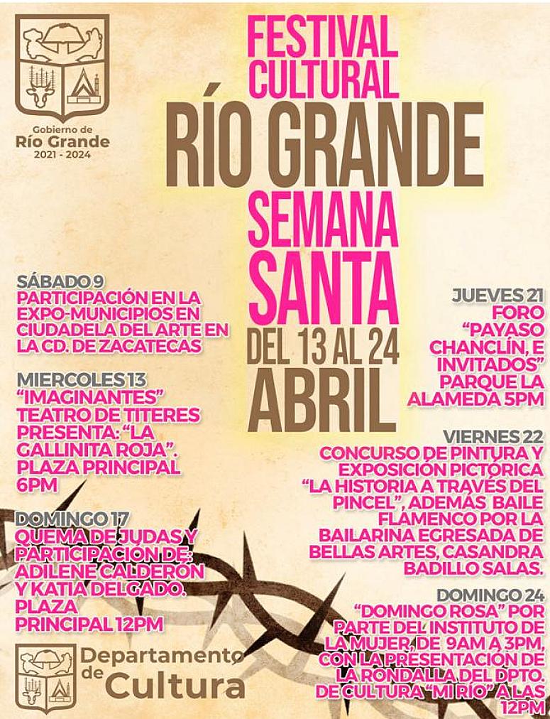 Mario Córdova Longoria, presidente municipal de Río Grande, informó que desde el pasado 9 de abril y hasta el 24 de abril del presente se tiene programa una serie de actividades artísticas, culturales y turísticas para todas las edades.