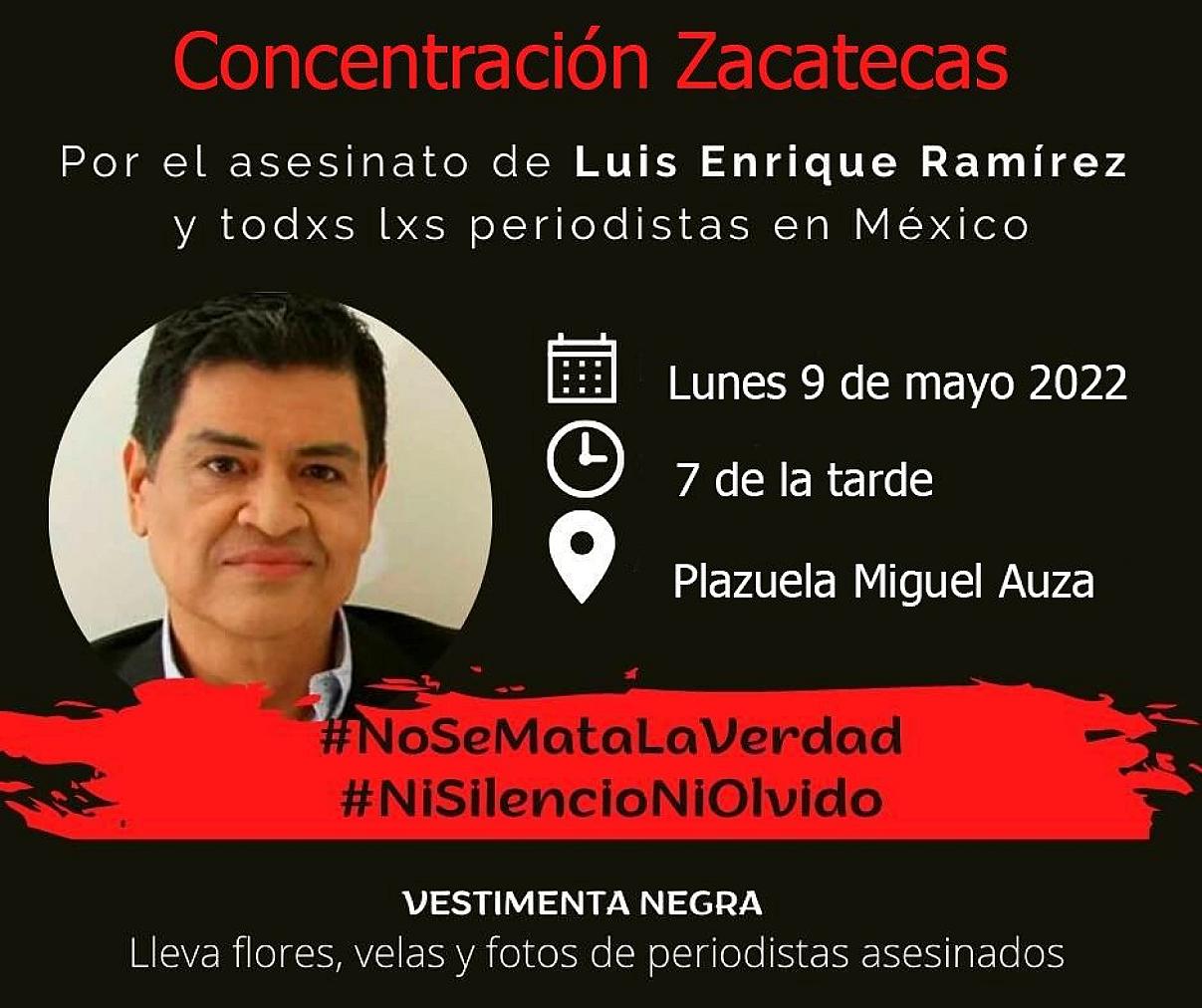 ZACATECAS, ZAC.- Este lunes, a las 7 de la tarde, se concentrarán periodistas zacatecanos en la plazuela Miguel Auza, para alzar la voz luego del asesinato de Luis Enrique Ramírez, columnista y fundador del portal de noticias Fuentes Fidedignas de Culiacán, Sinaloa.