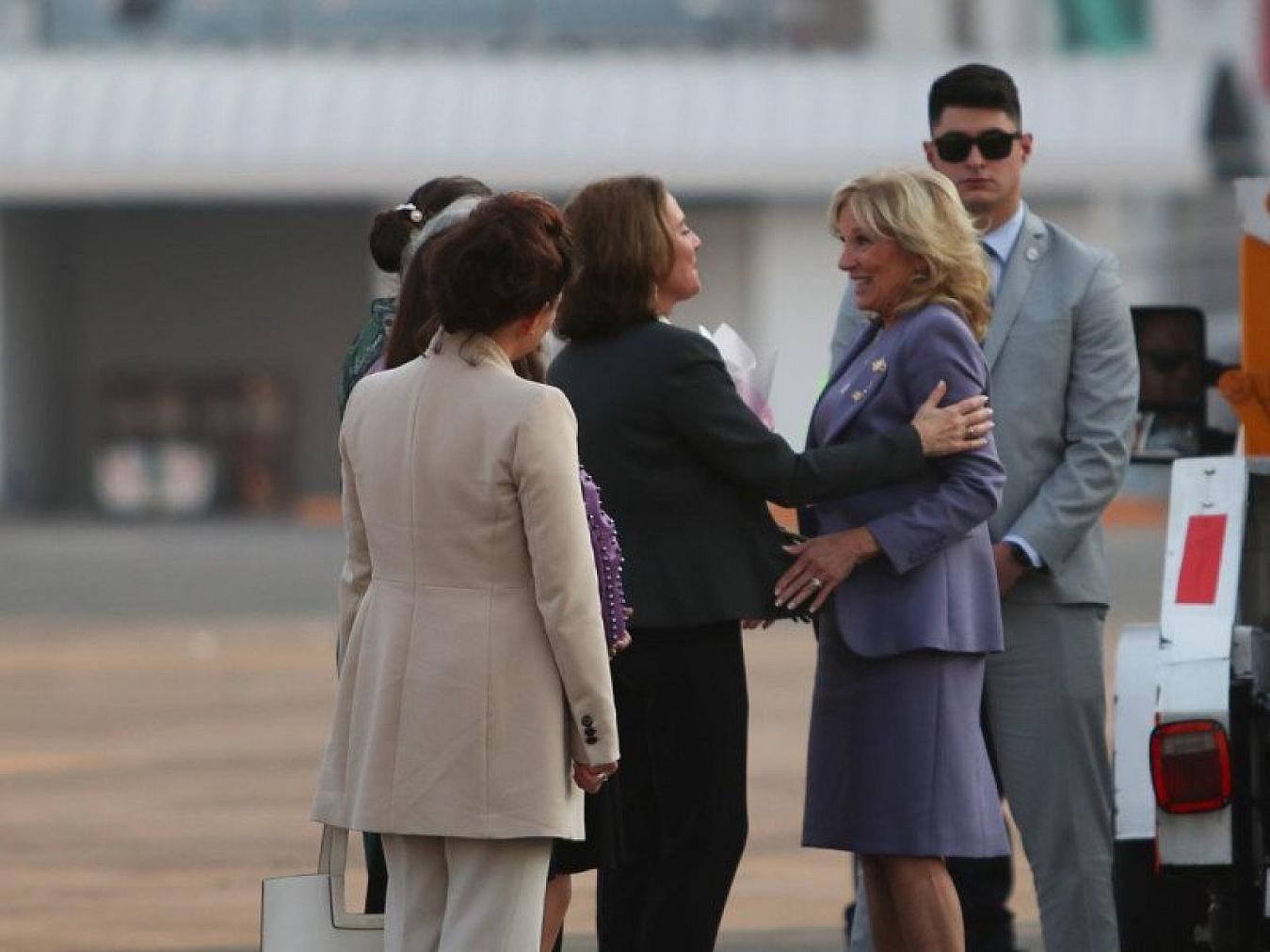A las 5:06 de la tarde de este domingo, la primera dama de Estados Unidos pisó suelo mexicano y la recibió Beatriz Gutiérrez, quien le dio un abrazo y le entregó un ramo de flores.