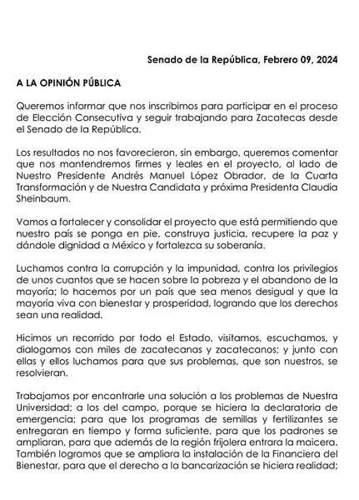 A través de un comunicado, informó que se inscribió para participar en el proceso de elección consecutiva y seguir trabajando para Zacatecas desde el Senado.
