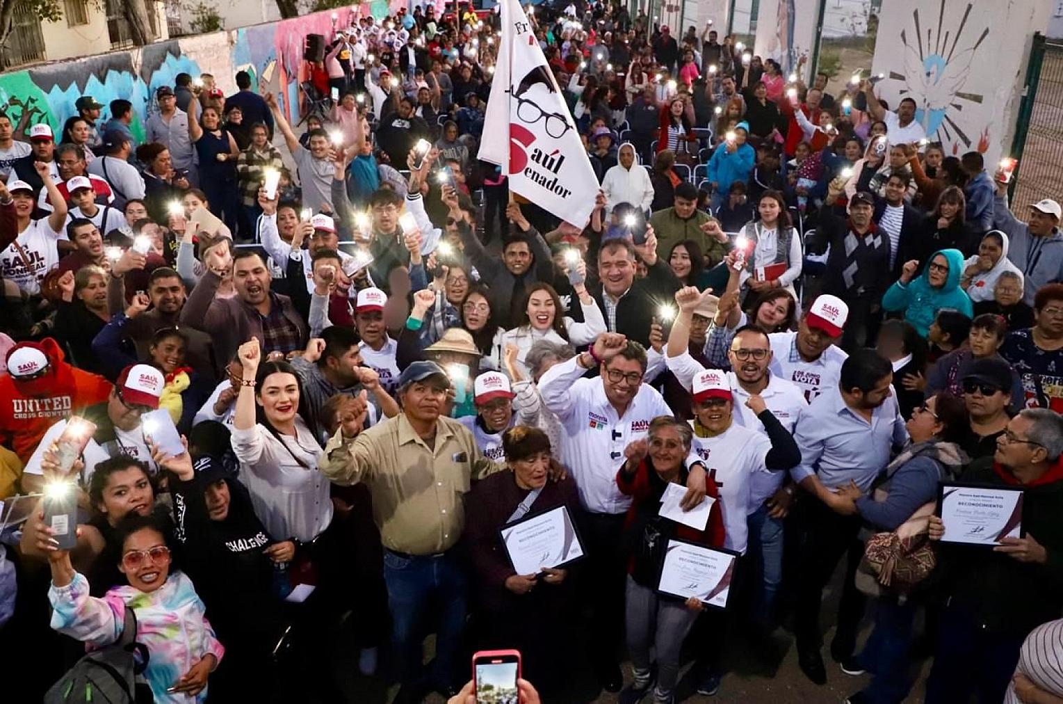 El candidato Saúl mencionó que en el sexenio del presidente Andrés Manuel, han aumentado los empleos en un máximo histórico, así como los empleos afiliados al IMSS, esto significa certeza de derechos sociales. El aumento del salario mínimo es otro de los frentes de la estrategia de seguridad nacional. El primero de enero de este año se dio el sexto aumento salarial, que ahora es de 249 pesos diarios o siete mil 508 pesos mensuales. “Cuando inició la administración de AMLO, apenas había un salario de 88 pesos. El presidente acaba de mandar al Poder Legislativo, está por aprobarse la reforma de Ley al artículo 123, que fijará los salarios mínimos, nunca más por debajo de la inflación, como ocurrió en el periodo neoliberal, mermando hasta en 70 por ciento el poder adquisitivo de millones de trabajadoras y trabajadores durante décadas ¡cómo no quererlo!”, agregó.