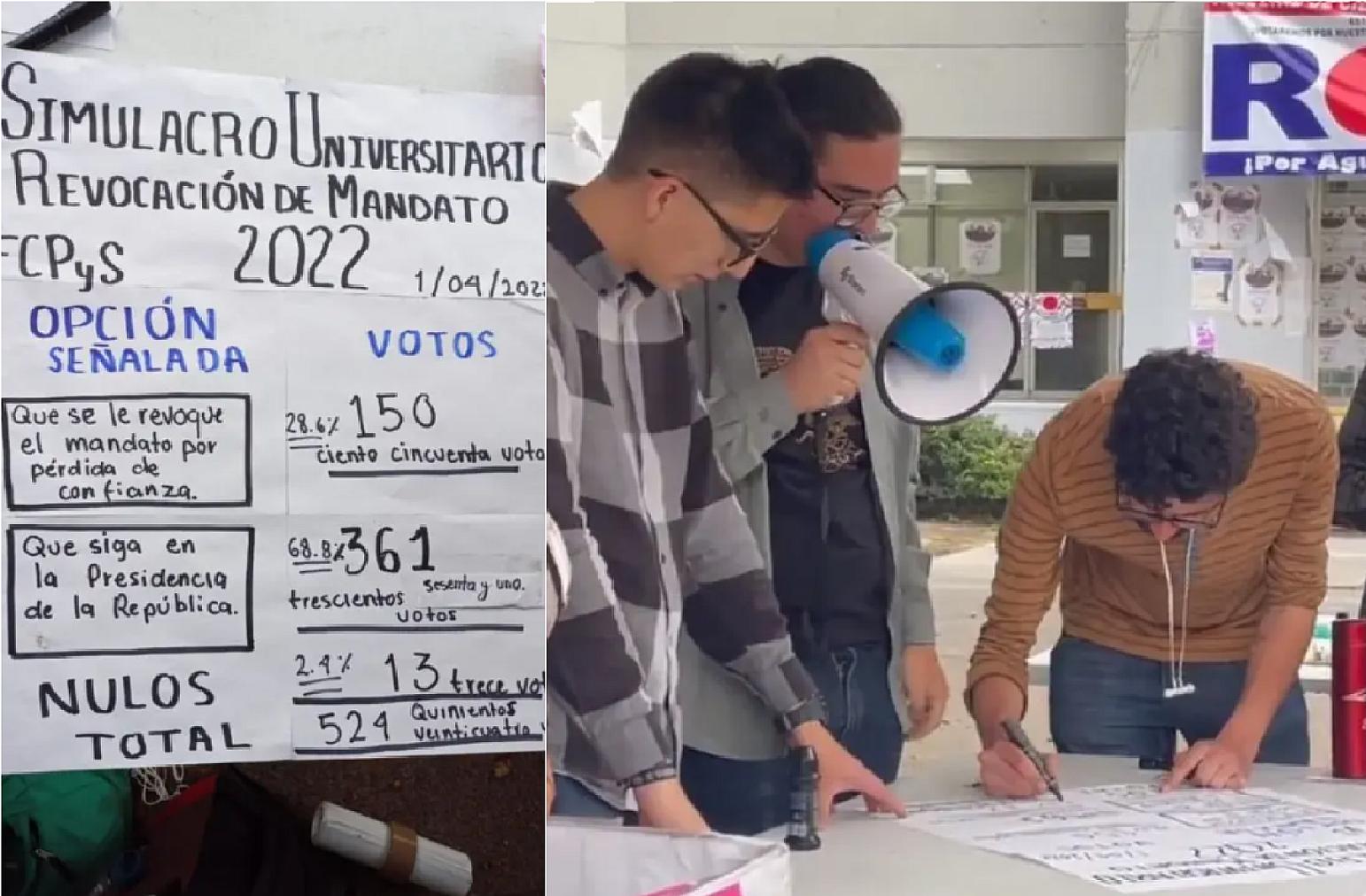 CIUDAD DE MÉXICO. - El viernes por la tarde un grupo de estudiantes de la Facultad de Ciencias Políticas y Sociales y otras facultades de la UNAM realizó un simulacro de la consulta de la revocación de mandato del presidente Andrés Manuel López Obrador, y consiguió la participación de 524 personas, de los cuales 361 (68.8%) votaron porque siga en su cargo el mandatario tabasqueño.