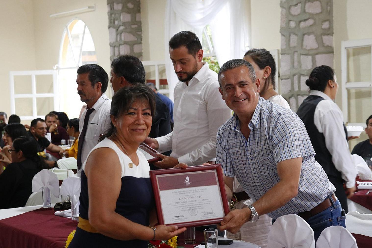 En compañía de autoridades educativas, el presidente entregó reconocimientos a docentes que cumplen 30 y 40 años de servicio, a quienes dijo que el mundo camina con la enseñanza; aseguró que son ellos lo más importante en la formación del ser humano y reconoció el liderazgo del docente en las comunidades, cuyas familias confían en él para que sea el enlace con cualquier autoridad.