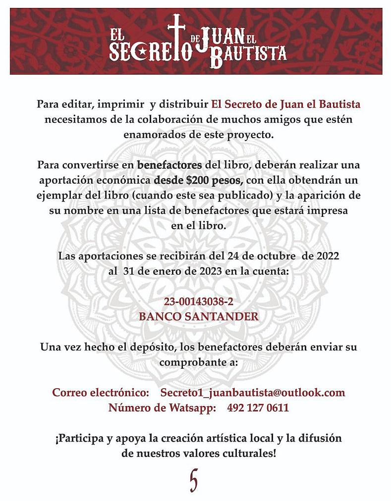 Las aportaciones para imprimir la novela se pueden hacer a través de la cuenta 23-00143038-2 del Banco Santander y enviar el comprobante al correo electrónico secreto1_juanbautista outlook.com o a través de WhatsApp al número 4921270611.