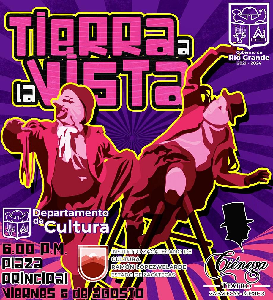 RÍO GRANDE, ZAC.- El Gobierno Municipal invita al público en general a disfrutar de la obra de teatro “Tierra a la Vista” este viernes 5 de agosto en la Plaza Principal a las 6 de la tarde.