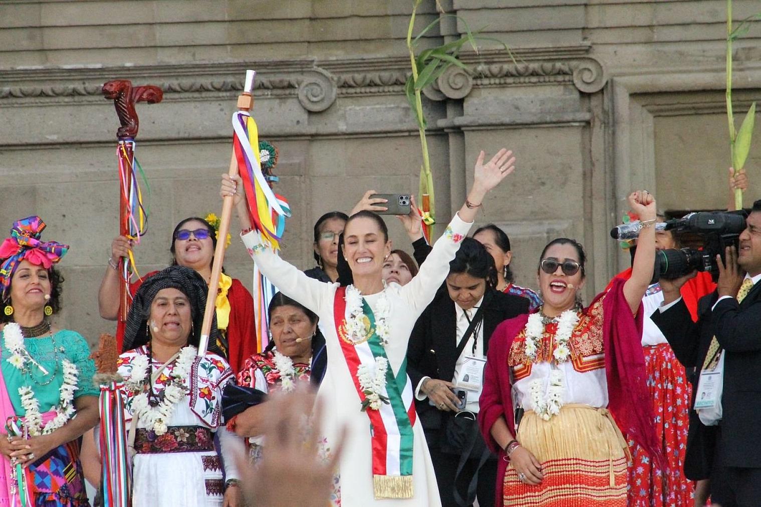 Sheinbaum Pardo destacó que el momento histórico que se vive en México se escribe con “a” de presidenta, señalando que “sólo lo que se nombra, existe”. Esto lo dijo en su mensaje, precedido por una ceremonia tradicional en la que se encomendó a los cuatro puntos cardinales. Las mujeres de las comunidades indígenas y afromexicanas le entregaron el bastón de mando, en un acto protagonizado por mujeres como la presidenta municipal de Chalcatongo, Oaxaca, María de Lourdes Jiménez Liera, quien expresó en náhuatl que ese objeto de madera simboliza la esperanza de millones de mexicanas.