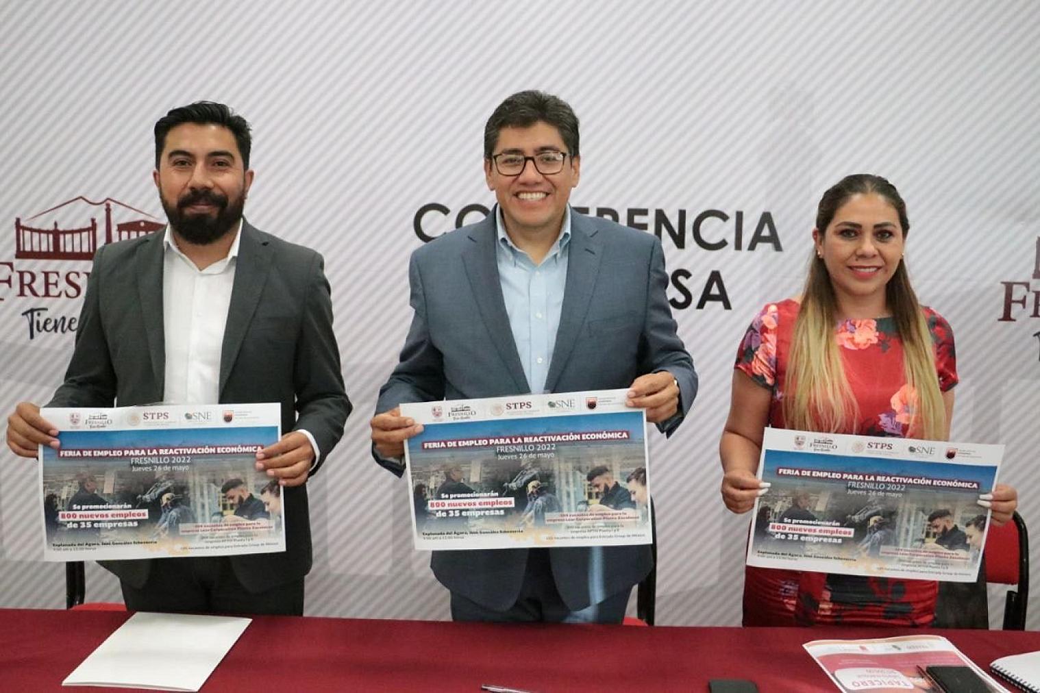 FRESNILLO, ZAC.- Con el objetivo de impulsar la reactivación económica del municipio, en conferencia de prensa se dio a conocer que el próximo jueves 26 de mayo, en la explanada del Ágora se llevará a cabo la Feria del Empleo, donde se ofertarán más de 800 puestos para 35 empresas locales y del extranjero.