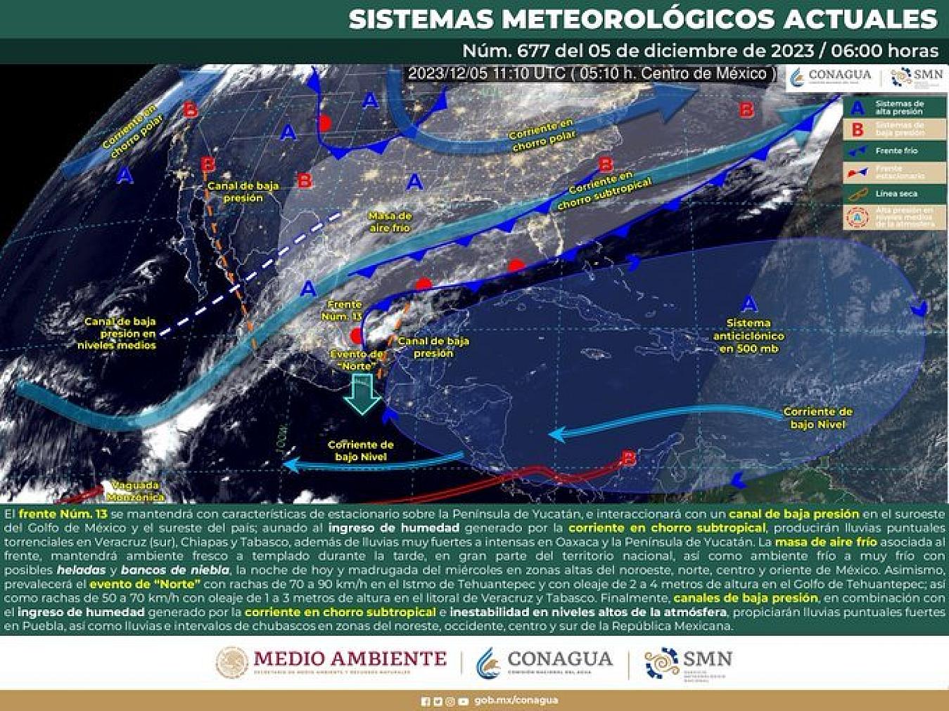 En su reporte diario sobre el pronóstico del clima, la Comisión Nacional del Agua (Conagua), a través de su Servicio Meteorológico Nacional (SMN), informó que este 5 de diciembre el frente frío número 13 se se mantendrá con "características de estacionario".