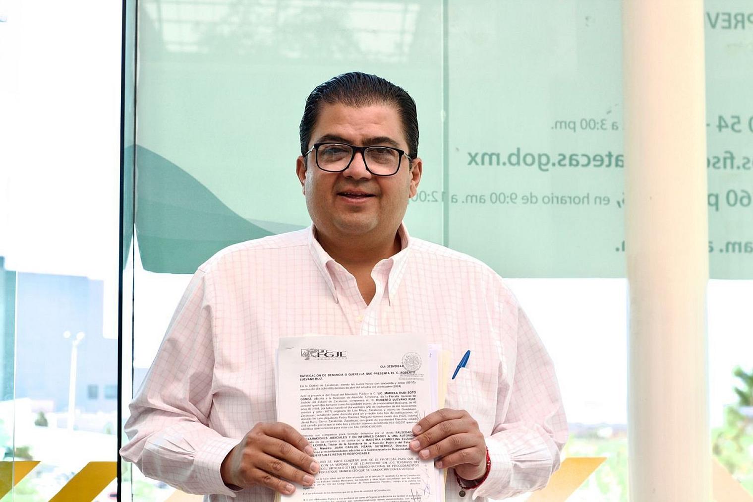 GUADALUPE, ZAC.- El candidato a la presidencia municipal de Guadalupe por la Coalición Fuerza y Corazón por Zacatecas, Roberto Luévano Ruiz, presentó una denuncia ante la Fiscalía General de Justicia del Estado de Zacatecas (FGJEZ) contra la Secretaría de la Función Pública (SFP) por mentir a una autoridad judicial con fines políticos.