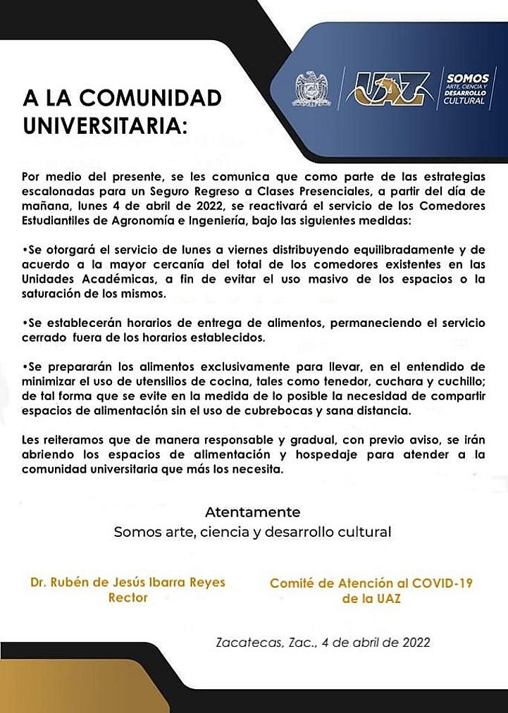 ZACATECAS, ZAC.- La Universidad Autónoma de Zacatecas (UAZ), refrendando su compromiso social con la comunidad universitaria y la sociedad zacatecana, y dio a conocer la apertura de los comedores de Ingeniería y Agronomía a partir de este lunes 4 de abril. Próximamente se estará informando sobre la apertura de más espacios de alimentación y hospedaje. (Ecodiario)