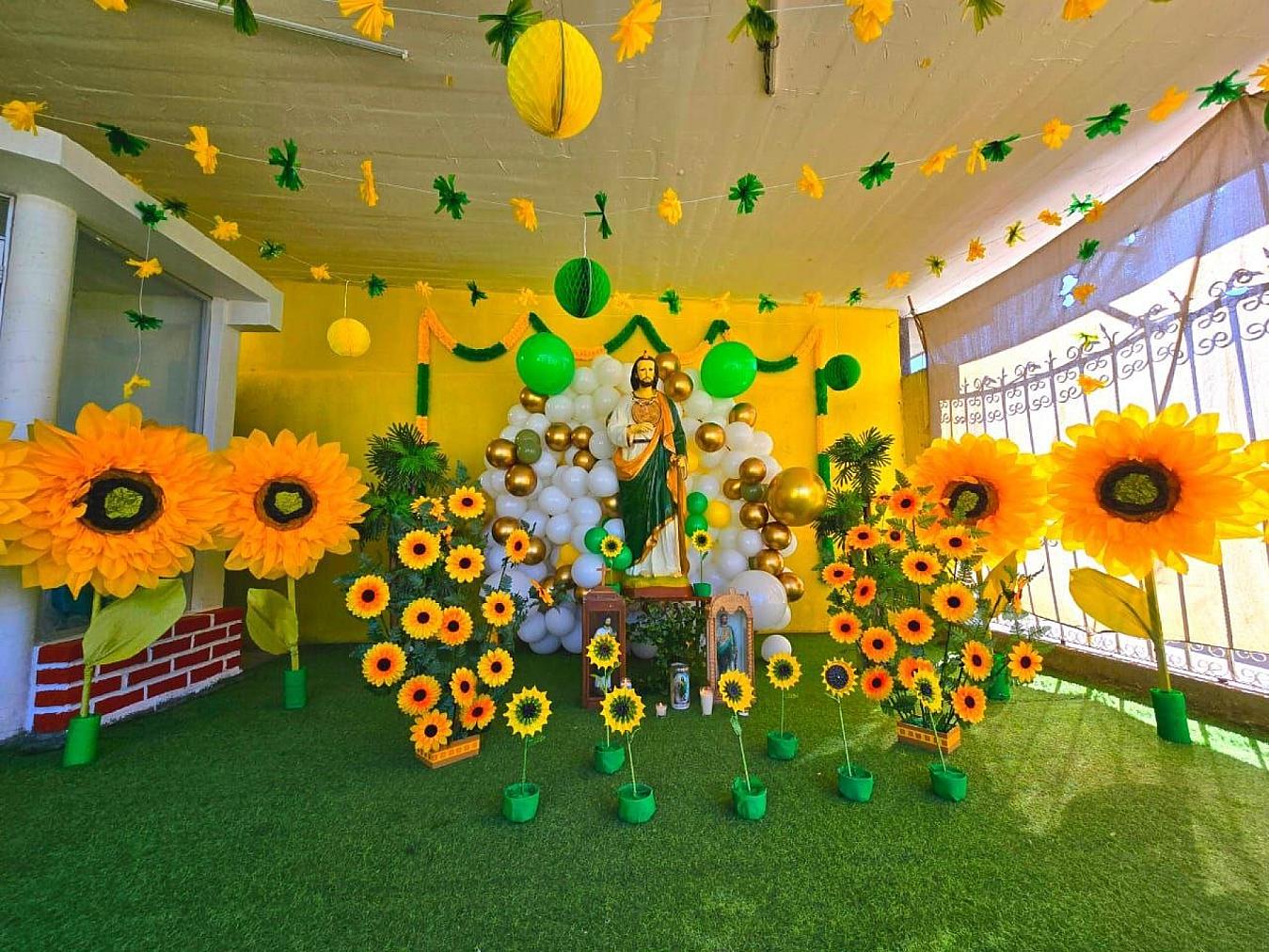 FRESNILLO, ZAC.- En la comunidad de plateros la familia Beache Pérez esfuerza cada año por mejorar el altar en honor a San Judas, en esta ocasión toda una habitación fue utilizada para la elaboración de esta ofrenda que le brindan al santo de las causas difíciles, donde el amarillo y verde predominaron.