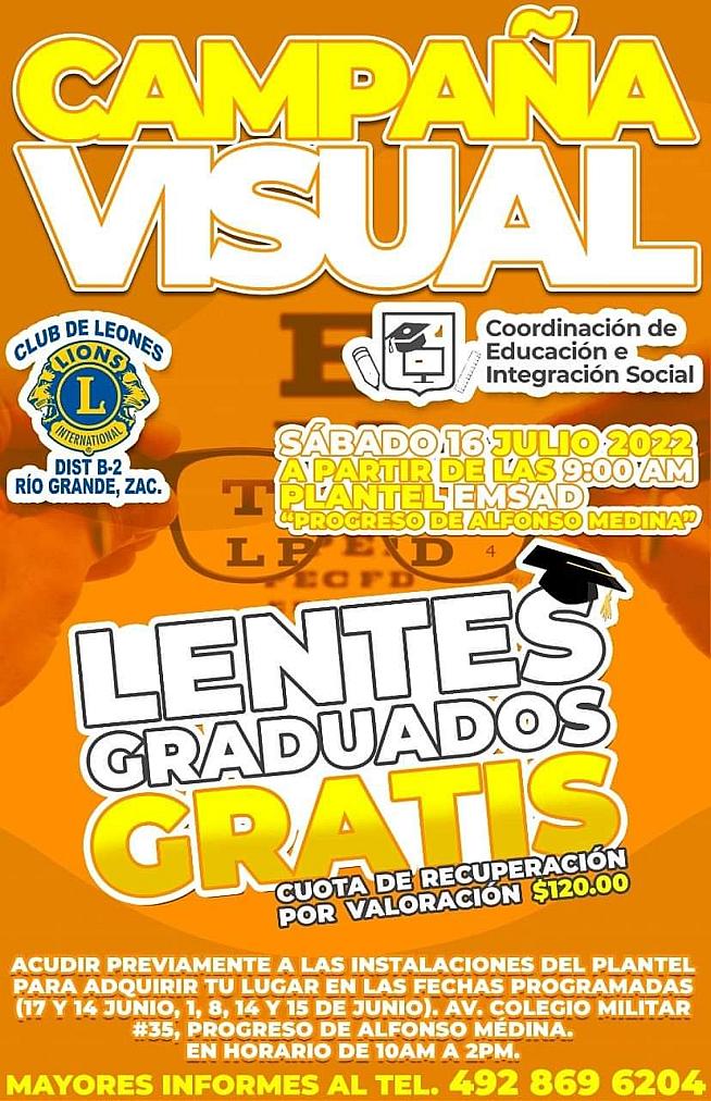 RÍO GRANDE, ZAC.- Una de las prioridades dentro del Ayuntamiento de Río Grande es atender las necesidades en materia de salud, por lo que, en esta ocasión por medio de la Coordinación de Educación e Integración Social, conjuntamente con el “Club de Leones de Río Grande”, se dio a conocer que se realizará la Campaña Visual.