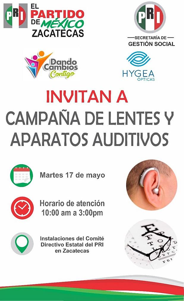 ZACATECAS, ZAC.- Con el propósito de promover la justicia social, el PRI en Zacatecas a través de su Secretaría de Gestión Social en conjunto con HYGEA Ópticas y la Fundación Dando Cambios Contigo, llevará a cabo la Campaña de Lentes y Aparatos Auditivos, como parte de los 16 convenios que implementó el partido a nivel nacional con diversas empresas e instituciones para ofrecer subsidios en sus servicios a los militantes de este instituto político.
