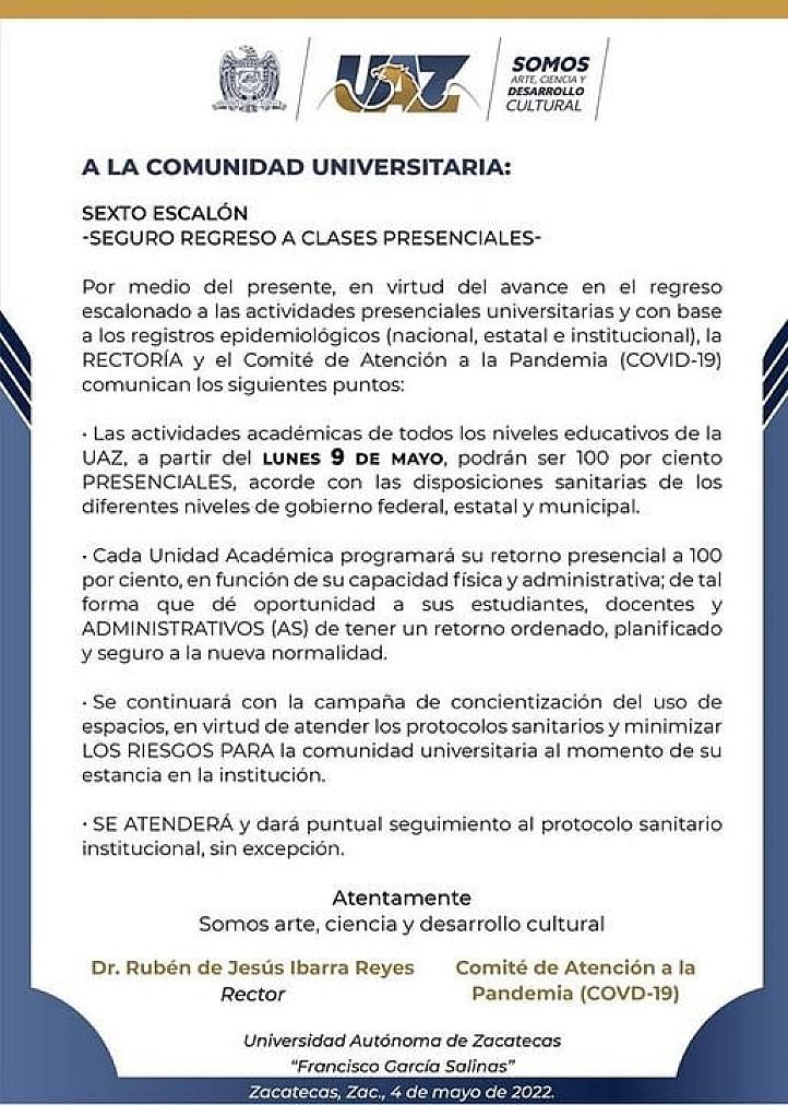 REANUDARÁ UAZ ACTIVIDADES 100 POR CIENTO PRESENCIAL EL PRÓXIMO 9 DE MAYO