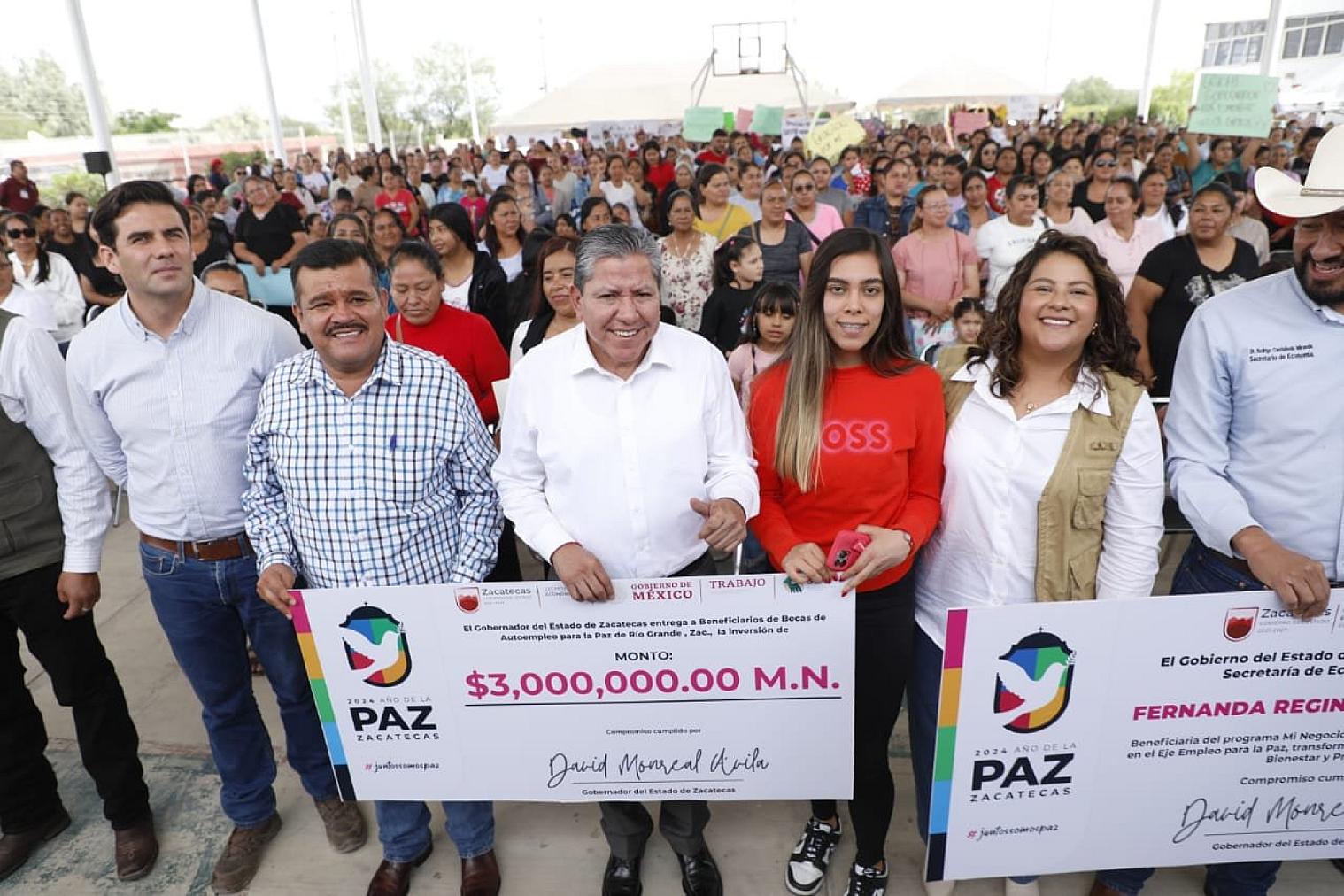 RÍO GRANDE, ZAC.- Con la finalidad de fortalecer la economía local y mejorar la calidad de vida de las familias zacatecanas, el gobernador David Monreal Ávila entregó becas de autoempleo a 640 beneficiarios de Río Grande y Juan Aldama.