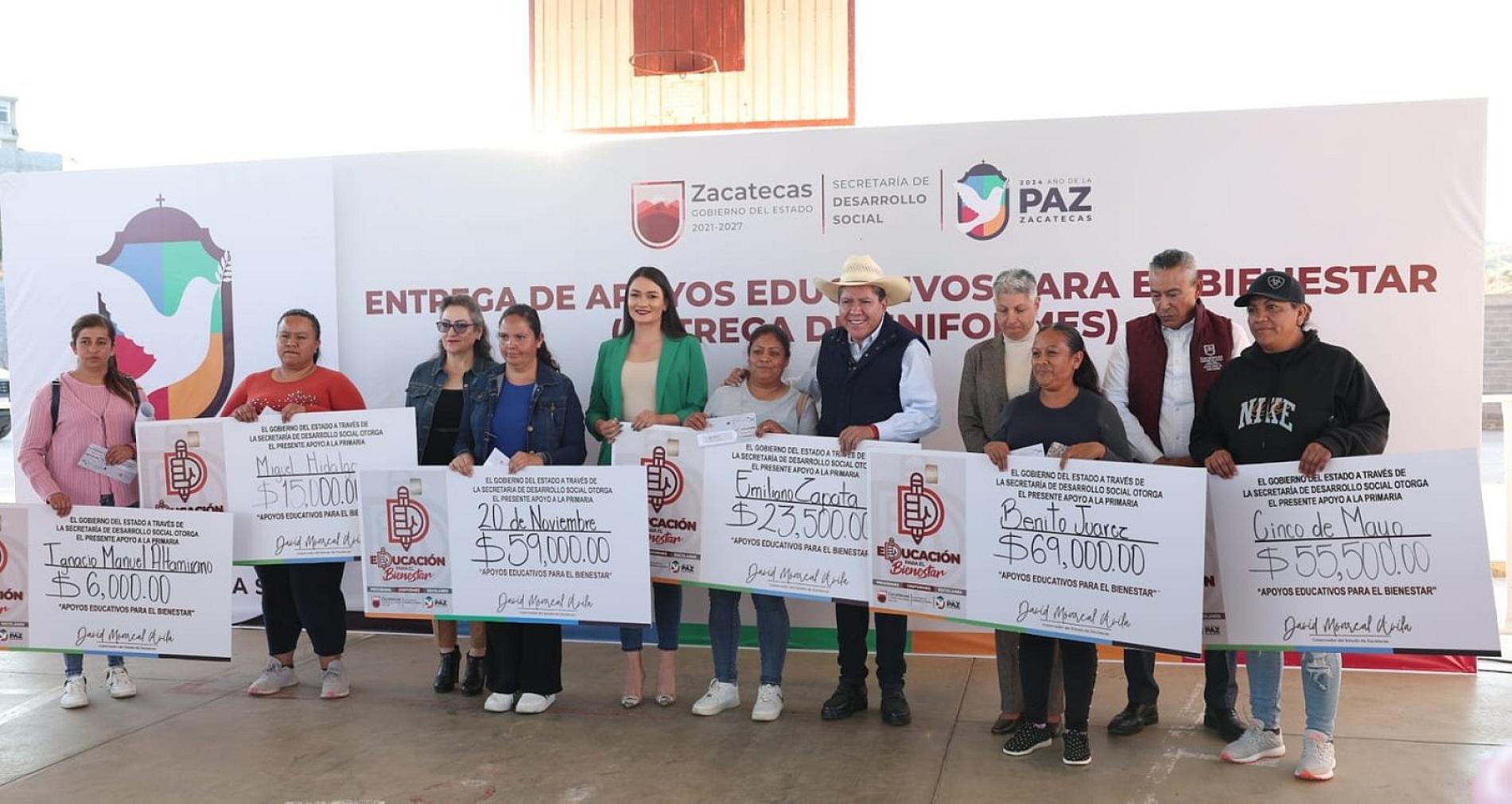 Acompañado por Bennelly Hernández Ruedas, titular de la Secretaría de Desarrollo Social (Sedesol), el gobernador David Monreal acudió a las instalaciones de la Escuela Primaria 20 de Noviembre, ubicada en la cabecera municipal, para entregar los cheques correspondientes para la adquisición de los uniformes.
