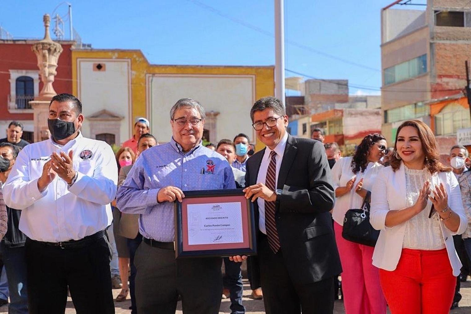 FRESNILLO, ZAC.- El alcalde Saúl Monreal Ávila encabezó los Honores a la Bandera que se realizaron en la explanada de la Casa Municipal de Cultura, donde reconoció al sector minero por su trayectoria, siendo el mayor productor de plata en el mundo y contribuir al desarrollo de Fresnillo.