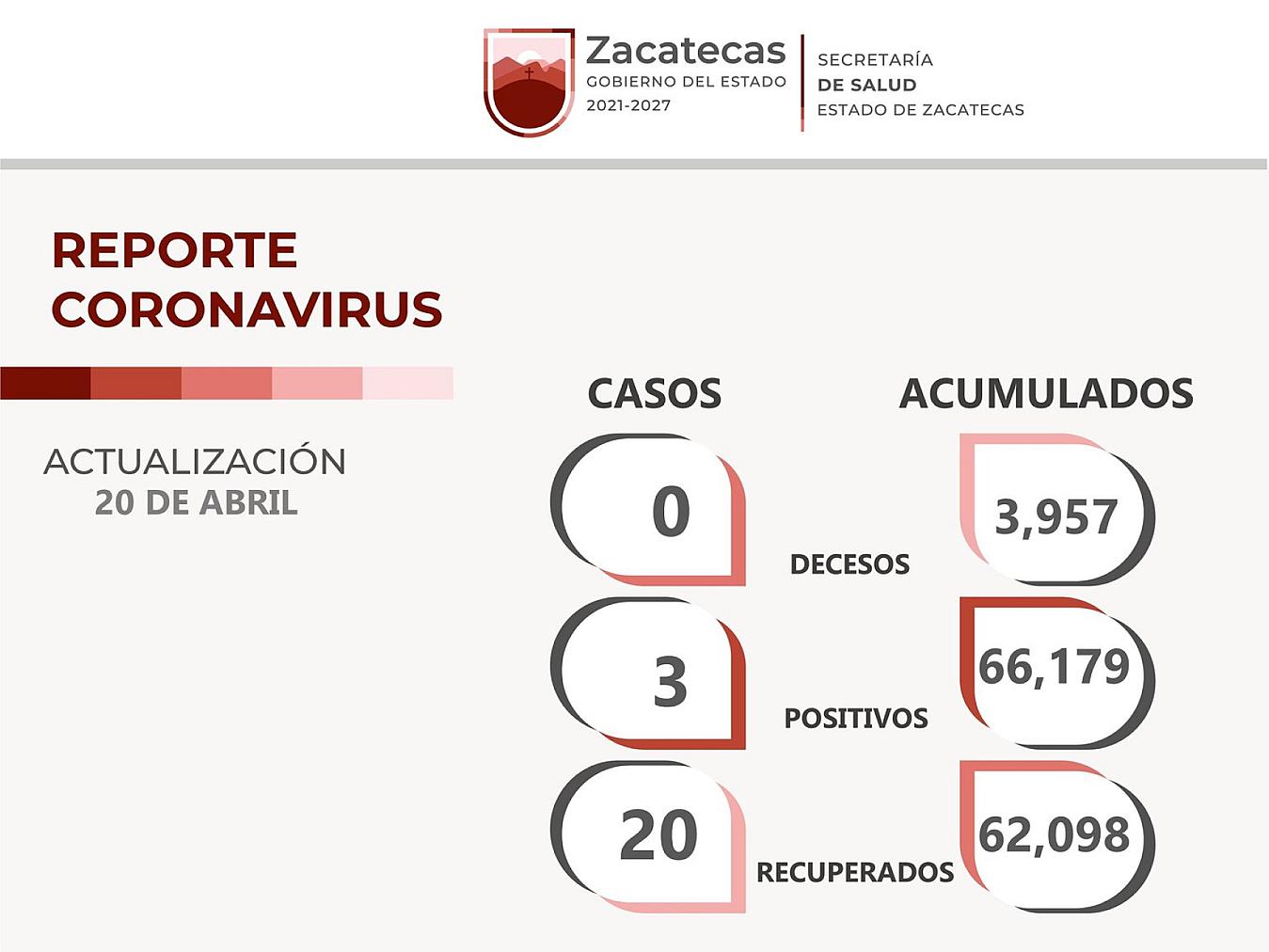 ZACATECAS, ZAC.- La Secretaría de Salud de Zacatecas (SSZ) informó que, en las últimas 24 horas, hay 20 personas recuperadas del Covid, tres nuevos casos positivos y ningún deceso asociado a la enfermedad.