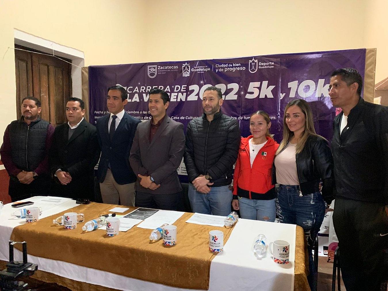 GUADALUPE, ZAC.- En conferencia de prensa, el alcalde Julio César Chávez Padilla, acompañado de la coordinadora General del Comité Organizador de la Feria de la Virgen de Guadalupe 2022, Wendy Valenzuela, y del organizador de la carrera, Jorge Ibarrarán, invitaron a los atletas a inscribirse y participar en la competencia.