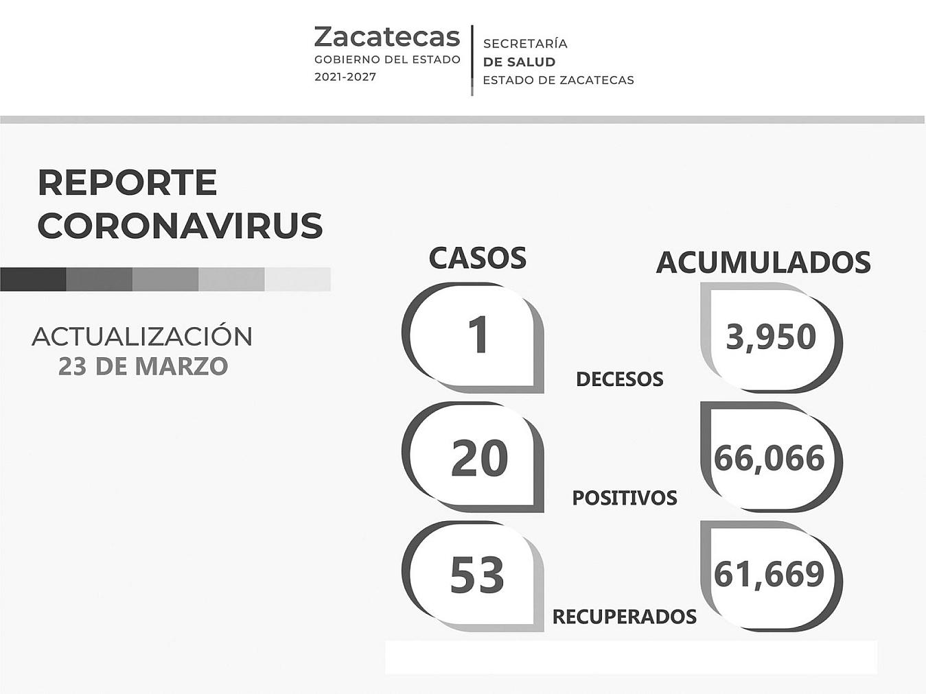 ZACATECAS, ZAC.- El reporte del Covid-19 que emitió la Secretaría de Salud de Zacatecas (SSZ) indicó que hay 53 personas que fueron declaradas como recuperadas del virus, 20 que se contagiaron y un fallecimiento asociado a la enfermedad.