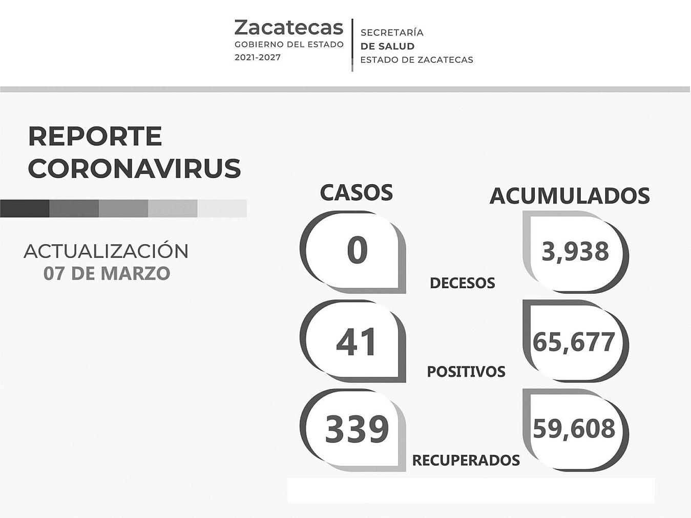 ZACATECAS, ZAC.- Por cuarto día consecutivo, la Secretaría de Salud de Zacatecas (SSZ) no registró fallecimientos a causa de Covid-19 en el estado; en tanto, se reportaron 339 pacientes recuperados y 41 nuevos contagios.