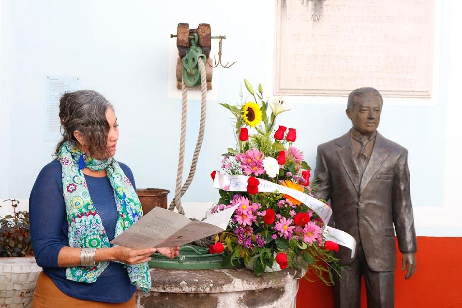 JEREZ, ZAC.- Poetas de diversas partes del país, participantes en la Novena Mesa de Lectura del Festival Internacional de Poesía Ramón López Velarde, rindieron tributo al creador de la Suave Patria, al colocar una ofrenda floral ante la efigie que en su honor se erige junto al “Viejo pozo”, ubicado en el patio de la casa donde viera la luz primera el llamado cantor de la provincia.